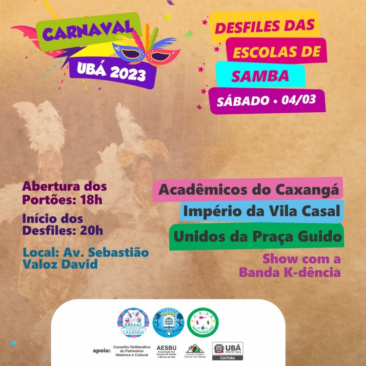 A programação do desfile das Escolas de Samba do Carnaval Ubá 2023 contará também com show da Banda K-dência.