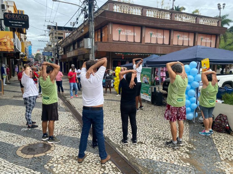A programação de atividades contou com um alongamento, seguido de uma caminhada pelo Calçadão, que teve a participação dos grupos de atividade física da Secretaria de Saúde e Unimed, servidores da Secretaria de Saúde e Gerência Regional de Saúde.
