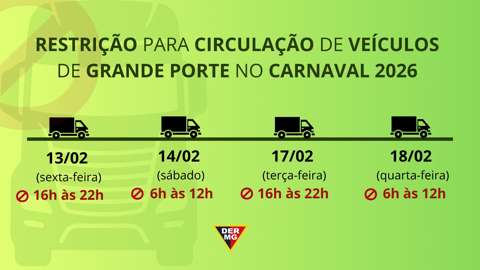 Com a proximidade do Carnaval 2026, cresce o fluxo de veículos nas rodovias estaduais de Minas Gerais. Para garantir mais mobilidade e segurança aos usuários, o Departamento de Estradas de Rodagem de Minas Gerais (DER-MG) intensifica suas ações durante o período festivo e publicou Portaria que estabelece restrições ao tráfego de veículos de grande porte nos feriados ao longo do ano.